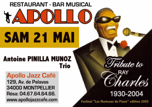 MAREUIL 2006 Le Trio A.PINILLA-MUNOZ se produit pour la deuxième année consécutive dans le cadre du festival ''LES MARTEAUX DU PIANO'' de Montpellier. Le concert aura lieu à la brasserie du DÔME le 28 avril. Le trio A.PINILLA-MUNOZ est progammé au festival de jazz''off'' de Montauban le 18 juillet pour un hommage à Ray CHARLES. Au programme de ce même festival figure, entre autre, la célèbre organiste américaine Rhoda SCOTT.